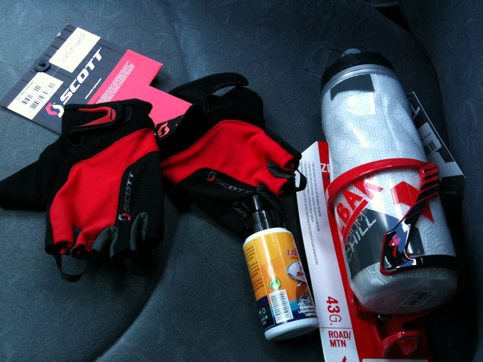 - luvas scott sem dedos (a condizer com as cores da bike, como se pode ver...), sendo mais frescas que as outras e permitem manipular no telemóvel, sem ter que as tirar